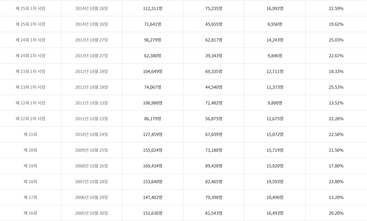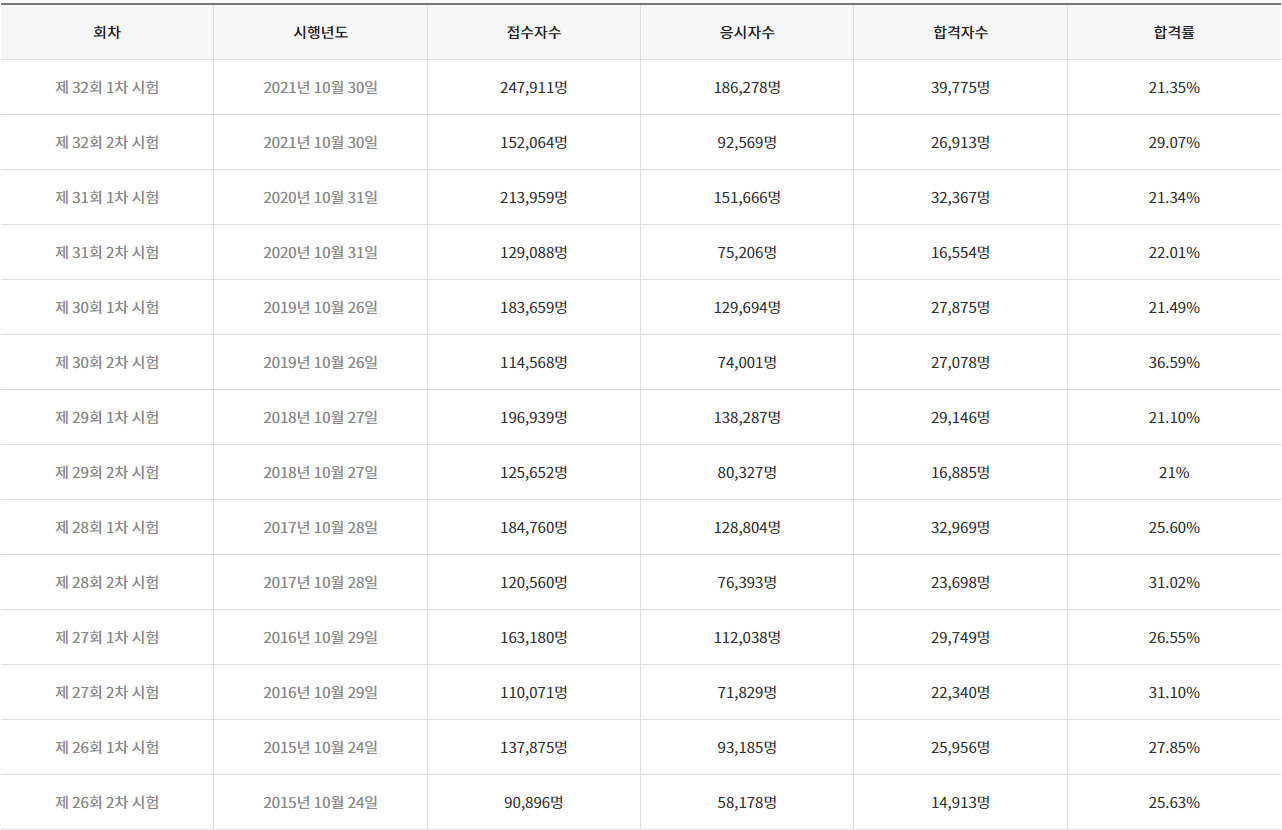 최근 5개년 합격률에서 1차가 2차보다 낮은 합격률을 보여줍니다 . 2차까지 도전하는 분들은 어느정도 준비를 하고 응시를 하기때문이라고 생각합니다. (난이도만 놓고보면 2차가 훨씬 높습니다)