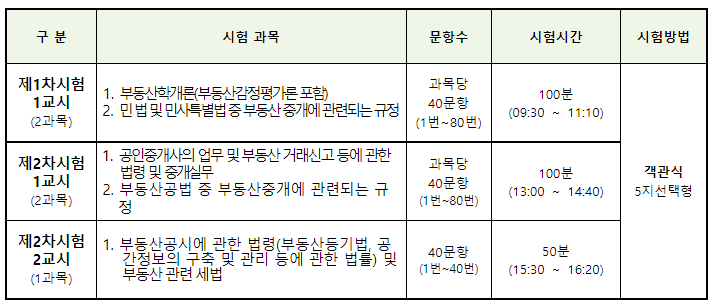 - 2차 : 공인중개사 법령 및 실무, 부동산공법, 부동산 공시법령, 부동산세법