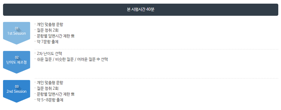 본격적인 테스트는 본 시험에서 치뤄지며 기본 7문항으로 출제되어 개인 맞춤형 문항으로 진행됩니다.