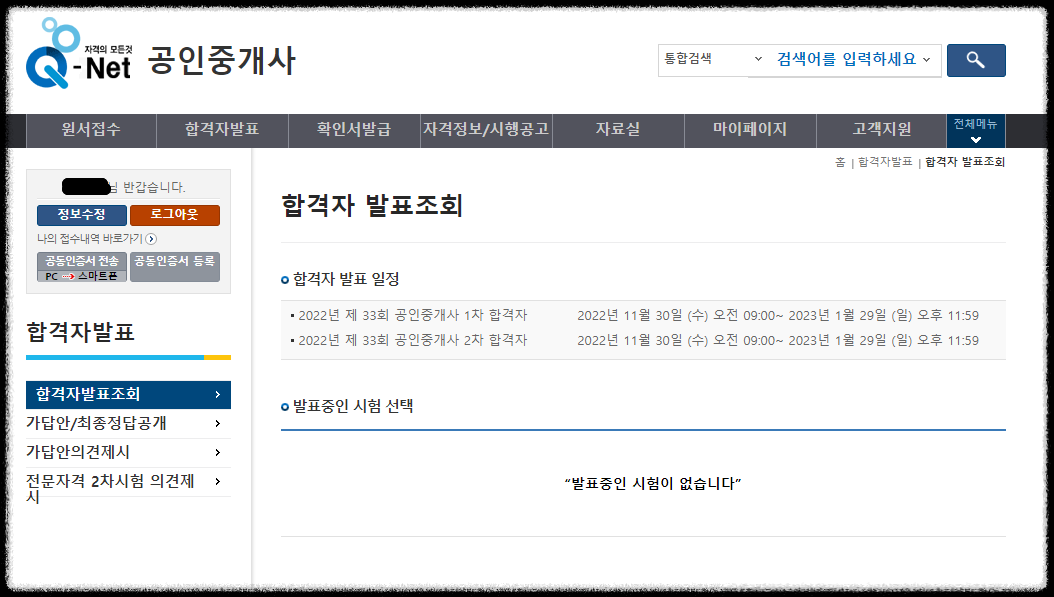 33회 공인중개사 합격자 발표 조회는 Q-Net(큐넷) 공인중개사 사이트에서 가능합니다. 로그인 후 [합격자 발표조회]를 클릭하시면 조회가 가능합니다.