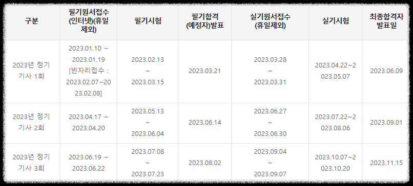 2023년 전기기사 시험 일정은 필기 2월, 3월, 5월, 7월입니다. 실기는 4월, 7월, 10월입니다.