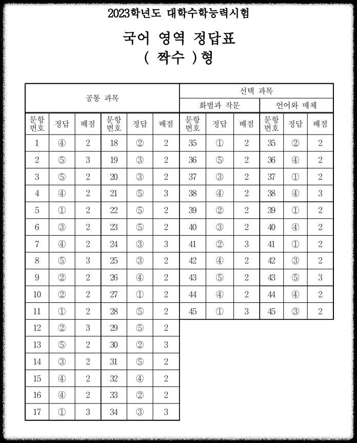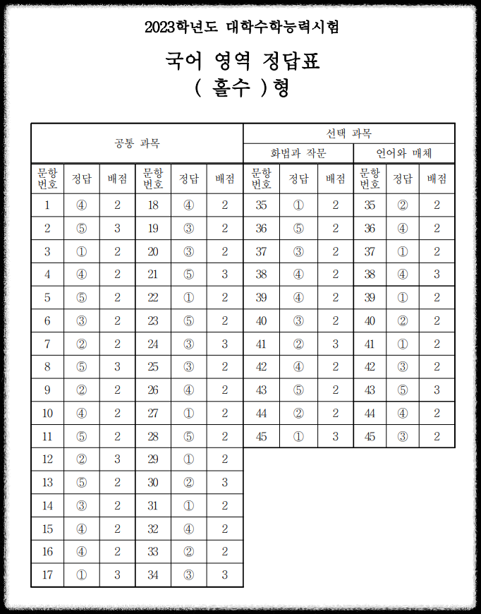2023년도 수능 국어 답안지 (홀수, 짝수)