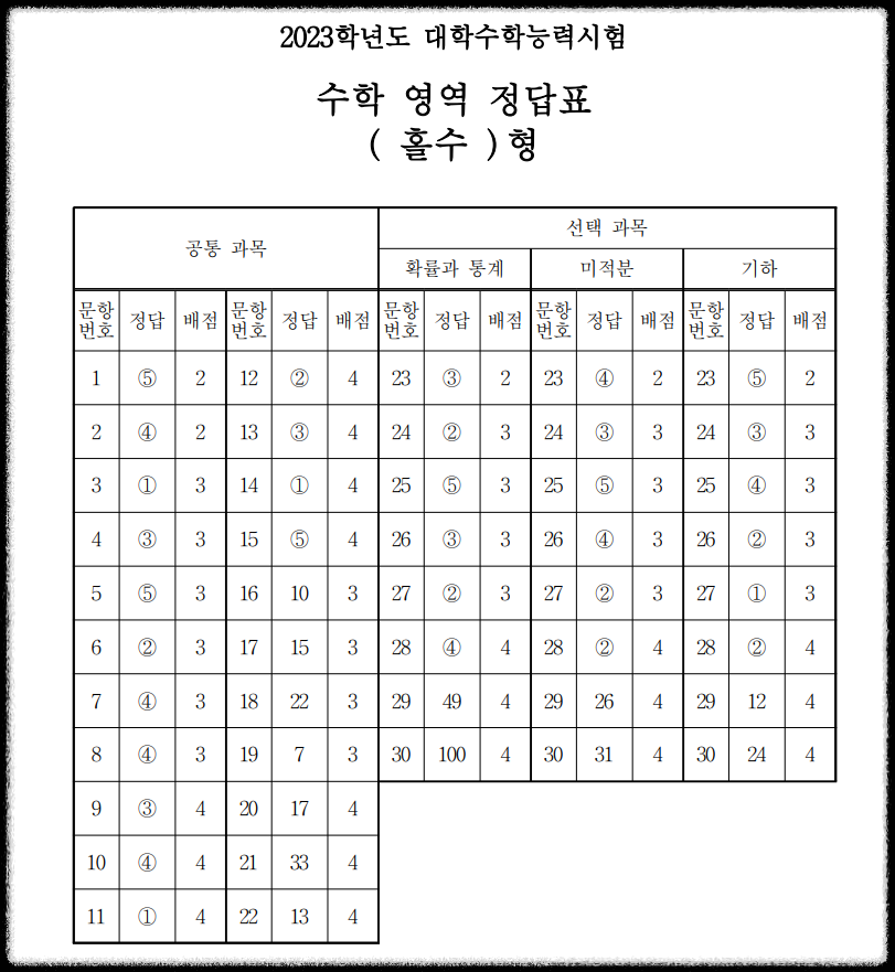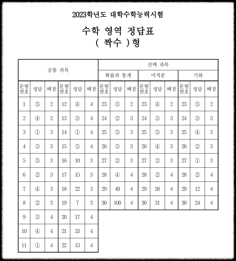 2023학년도 수능 수학 답안지 (홀수,짝수)