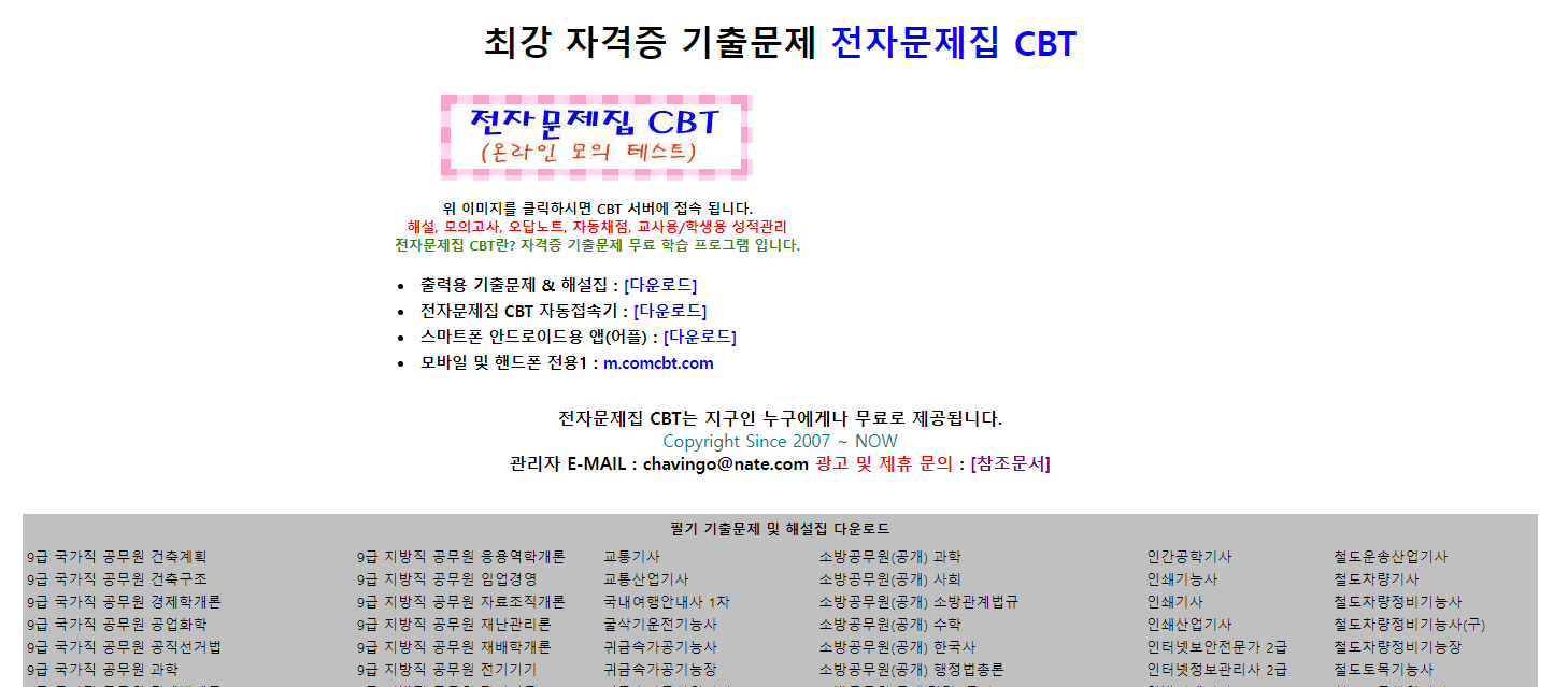 공무원, 공인중개사, 각종 기사 시험 등의 자격증 기출문제를 제공하는 최각 자격증 사이트입니다. 2007년부터 운영되어 온 것으로 보이며, 상당히 많은 기출문제 DB를 보유하고 있는 웹사이트인데요. 웬만한 자격증 기출은 이 곳에서 모두 받으 실 수 있을 겁니다.