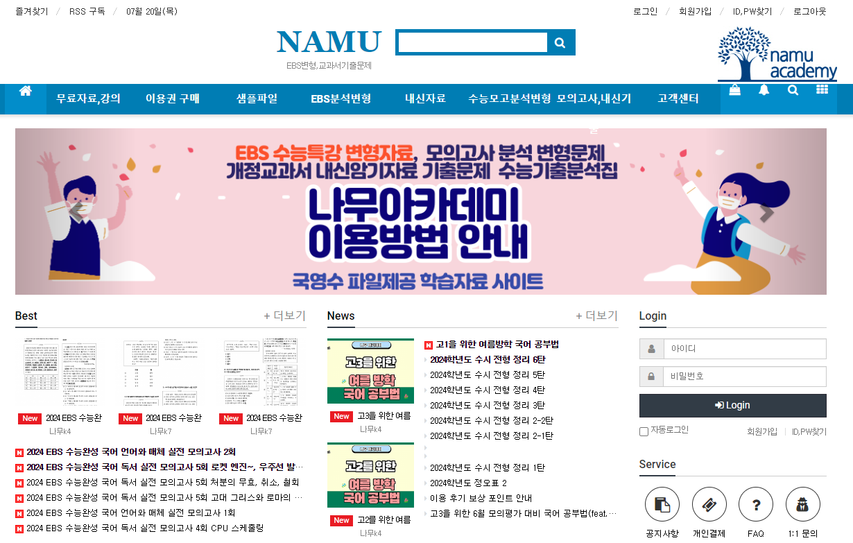 중등, 고등 내신 기출문제 다운로드를 받을 수 있는 나무 아카데미입니다. 회원제로 운영되고 있으며, 포인트를 충전하여 내신 기출문제를 받아보실 수 있습니다. 내신 이외에도 수특, 수완 실전 모의고사도 제공하고 있습니다. 가격대가 조금 비싼게 흠이긴 하네요. (1개 자료 1500포인트)