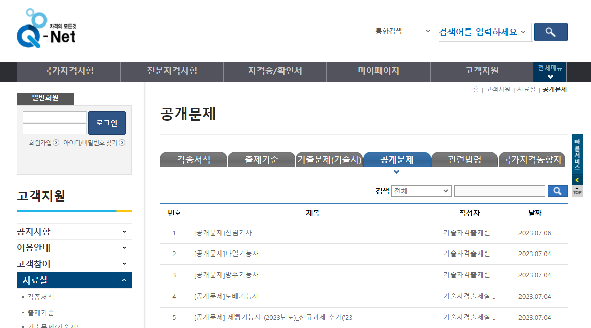 국가자격증 및 전문자격증 기출문제를 공식적으로 제공하고 있는 큐넷입니다. 국가에서 운영하는 사이트로 기출문제가 다양하진 않지만, 만약 해당되는 시험에 응시하신다면 이 곳에서 다운로드 받는 것을 추천합니다. 기출문제 및 시험 운영방식에 대해 파악할 수 있습니다.