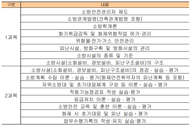 먼저 한국소방안전원에서 교육일정에 맞춰 강습교육을 이수하셔야 합니다. 1일 8시간 교육이 진행되며, 소방안전관리자 1급 교육비 48만원, 2급 24만원, 3급 14만4천원입니다.
